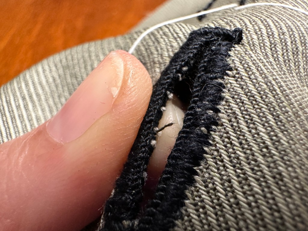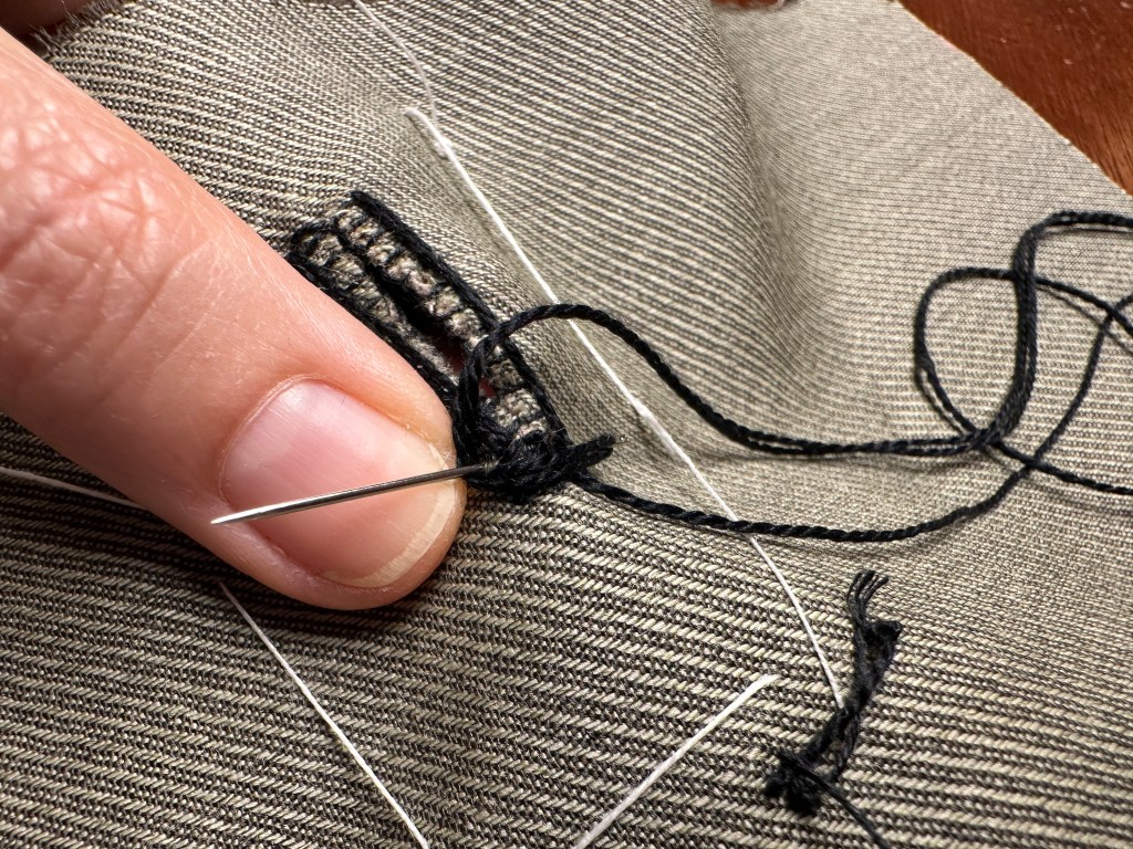 This is what the buttonhole looks like after the blanket stitches are done. They’re fairly far apart but they only stabilize. Note the inner line of thread on the edges of the cut itself.